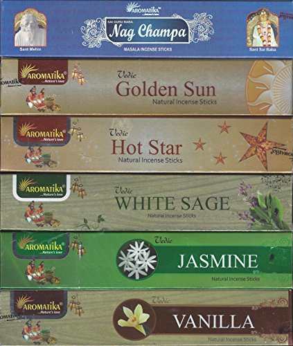 Aromatika - Set of 6 Nag Champa, Golden Sun, Hot Star, White Sage, Jasmine, Vanilla (Incense Holder Included)