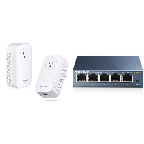 -. Binding : Product Bundle -. Feature : Expands your network into areas of the home needing better coverage / Gigabit Ethernet port connects devices like smart TVs, game consoles, and PCs to your network / Five gigabit auto-negotiation RJ45 ports greatly expand network capacity / Supports Auto-MDI/MDIX, eliminating the need for crossover cables -. PackageQuantity : 1 -. ProductGroup : Personal Computer -. ProductTypeName : COMPUTER_INPUT_DEVICE -. Title : TL-PA8010P KIT AV1200 Gigabit with Power Outlet Pass-through Powerline Adapter and TL-SG105 5-Port Gigabit Ethernet Desktop Switch
