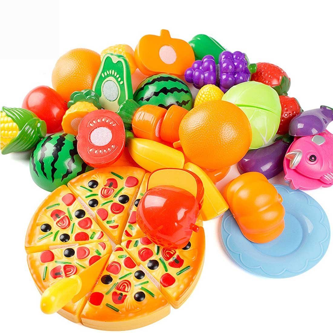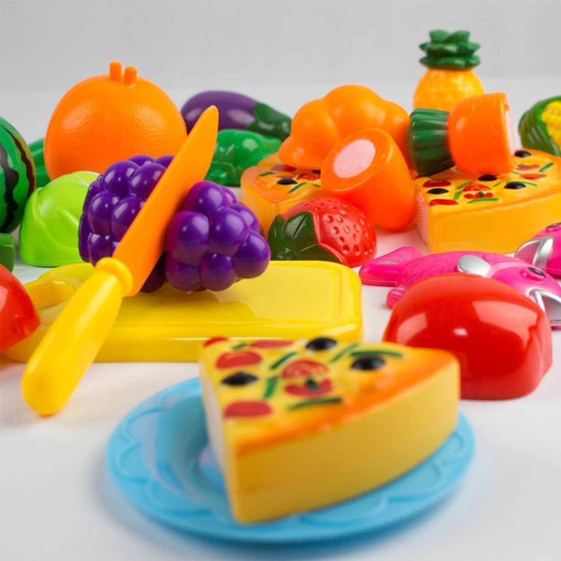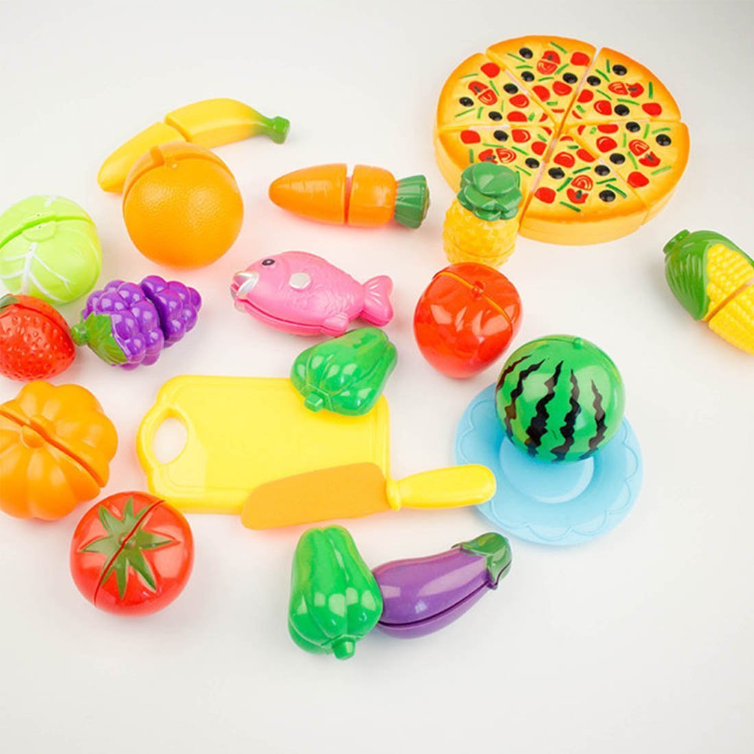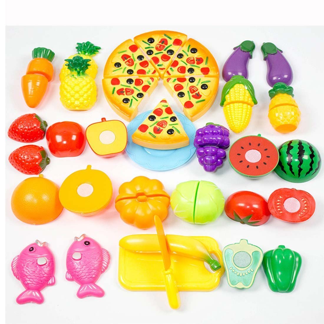 Kitchen knife, cutting board, small plate, cabbage, lemon, carrot, corn, pineapple, grape, piman, red pepper, strawberry, tomato, capucha, watermelon, banana, fish, eggplant, pizza (6pcs)