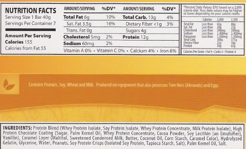 Studio : NutriWise Publisher : NutriWise Binding : Health and Beauty Product Description People often wonder how NutriWise created a protein diet bar that delivers so much good taste yet only contains 155 calories. We don't claim to know all their secrets but we do know they start with a blend of peanuts and soy crisps. They then wrap that mixture up in low-calorie caramel and wrap the whole thing up in luscious layer of low-fat chocolate. Enjoy as a mid-day snack and let the 12 grams of quality protein help get you over your worse mid-day slump. 0