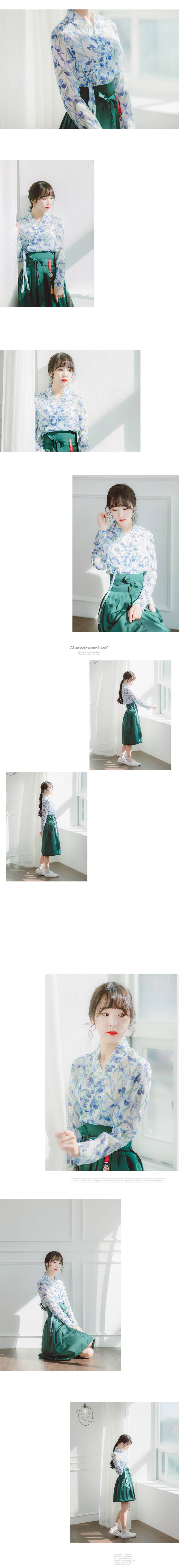 *모델 착용 사이즈:S *코디 아이템:딥초롱 허리치마 산뜻한 컬러감이 매력적인 초아 블라우스 저고리 얇고 부드러운 쉬폰 원단이 움직일때마다 여리여리 사랑스러운 모션을 선사해준답니다 은은한 블루톤 바탕에 청초한 플라워 패턴이 들어간 초아 블라우스 저고리인데요 잔잔한 주름이 전체적으로 잡혀있어 흔하지 않으면서도 고급스러움이 느껴지는데요 봄/여름/가을 언제나 입기 좋은 쉬폰 원단으로 비침이 있는 편이라 이너를 함께 입어주셔야 한답니다