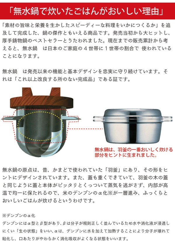 乾燥物以外は水を加えず、食品自体に含まれている水分だけで素材の旨味を生かした美味しい料理ができます。