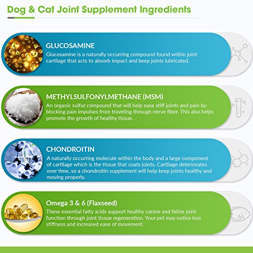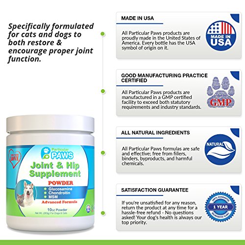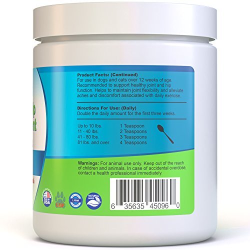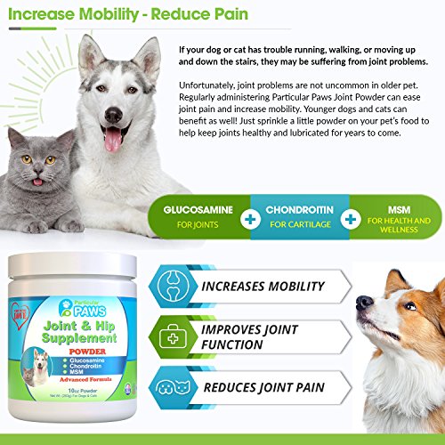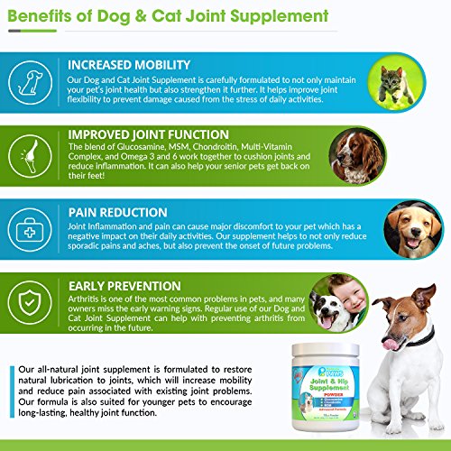 IMPROVES MOBILITY AND JOINT FUNCTION: If your dog suffers from stiffness, joint pain or other mobility issues, his or her entire quality of life can suffer. This dog and cat joint supplement powder is simply the most advanced formula available on the market. The blend of Glucosamine, Chrondroitin and MSM will naturally reduce inflammation and joint pain.