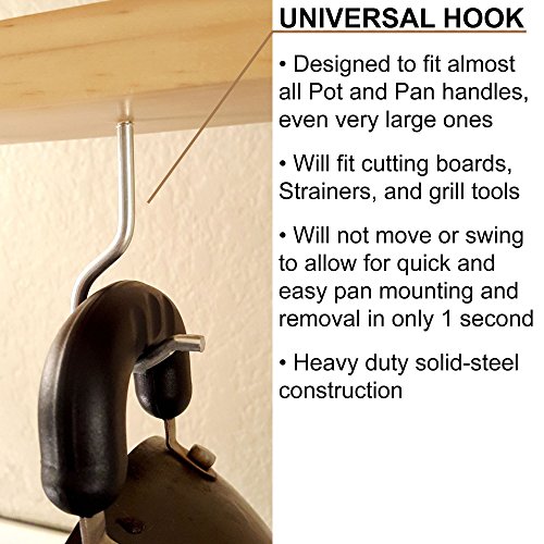- UNIVERSAL FIXED HOOKS: Hooks do not move or swing, making it fast and easy to hang or remove a pot in literally 1 second, using only 1 hand!; Pot only needs to be lifted off the hook, not turned at an angle to un-mount. Oversized hooks allow for even the largest handle designs to fit. Strainers, cutting boards, or large spatulas can be mounted easily.