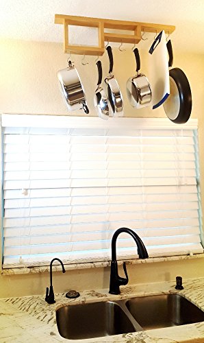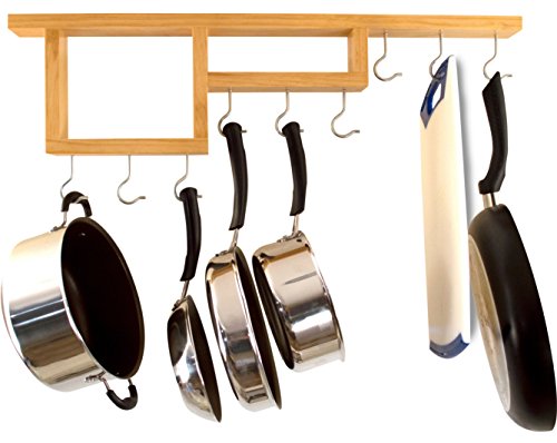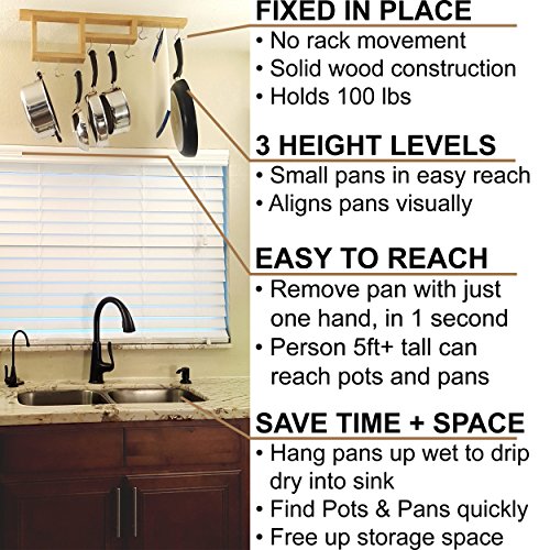 - HEAVY DUTY STATIONARY MOUNT: Fixed in place design prevents pot rack from swinging while hanging or removing a pot. Solid real wood design with steel hooks will hold over 100lbs.