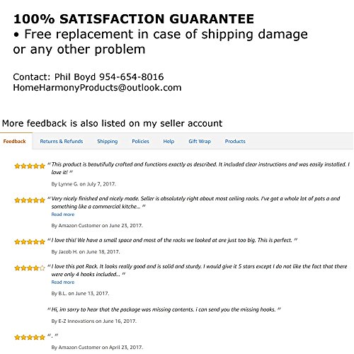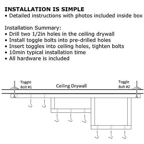 - EASY INSTALLATION ON 8FT CEILING: Easily mounts to 8ft ceiling with toggle bolts. People who are at least 5ft tall should be able to reach pots and pans with no need for a stepstool. All hardware needed for installation is included, as well as an easy to follow instructions page with photos, printed in English. Tools required: Drill, 1/2in drill bit, 1/8in drill bit, hammer, and screw driver. Total install time is 5 to 10min.
