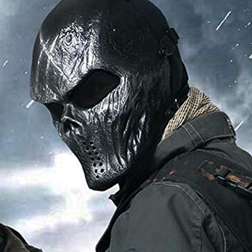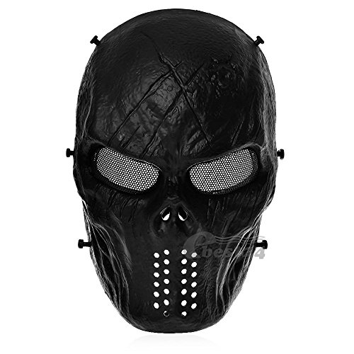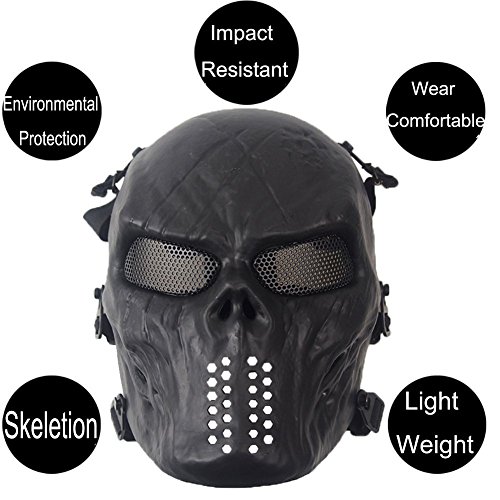 -. Feature : FULL FACE PROTECTION AIRSOFT MASK - Complete with metal mesh eye protection / RUBBER PADDED - Inside For Increased Comfort. Perforated mouth area assures breathability ● When you play Paintball game,have to wear a goggles together with this mask / LIGHT WEIGHT - Extended wear. Inside there are a couple different areas of padding, on the forehead and for the nose and cheeks. They're comfortable enough. / COOL DESIGN - This full face skull mask will look great with finished costume. The straps are easy to adjust so you can have it as tight or as loose as you want. It is also comfortable while wearing. Great for airsoft, hunting, war game and military use, Halloween party / MULTIPLE STRAPS - Mesh mask with a tight fit if you use this for airsoft or other outdoor activities that require a lot of movement. The multiple padded points on the inside provide for longer more comfortable use periods.The plastic has many holes allowing for great ventilation. The mask is very comfortable to wear, with the rubber padding on the inside. It is adjustable allowing for a great fit. It provides protection to the entire face.