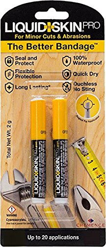 Liquid Skin pro works better than traditional bandages. Liquid Skin is a flexible adhesive that provides a secure and transparent protective seal. Unlike traditional bandages, Liquid Skin keeps germs and bacteria away from the affected area, providing instant relief for cracked skin and blisters. The angled tip application makes the adhesive easy to apply. Liquid Skin is ideally suited for areas of skin exposed to flexing, such as knuckles, knees, elbows, fingers and any area associated with work environments. Liquid Skin provides needed protection to seal and heal any minor cuts and abrasions, allowing you to get on with your day instantly. Great for activities such as automotive work, sports, yard work and much more Liquid Skin is 100% waterproof, sweat proof, touchless, quick drying and lasts up to 5 days. Includes set of two, 2g pipettes.Feature