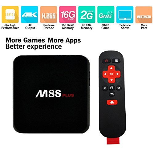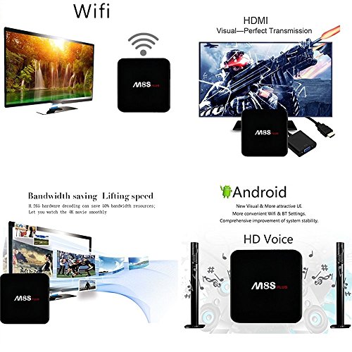 -. Feature : Free Subscription: Watch all of the latest movies, TV shows, and live sports with no monthly bills or costs! Why waste your money on cable or movie subscriptions when you can get the exact same viewing pleasure with Jabond TV BOX. / Full Loaded Add-ons: A lot of Add-ons (Facebook, Internet Browser, KODI, Showbox, CloudTV, Netflix, YouTube and more) are already installed to save your time and make your viewing experience the most enjoyable! You can also add your favorite add-ons by yourself through google play store or website freely. / High-profile TV Box: 2G RAM(DDR3) + 16GB(EMMC), support M8S Plus run fast and stable operation. With 16GB internal storage and max SD extended capacity 32G , you have enough space and freedom to install apps you like without worry about running out of space. / Stable and 4K Streaming : Dual-band AP6330 WIFI 2.4GHZ and 5GHZ, support 802.11 and has 10/100M ethernet fast speed, which confirm more stable WIFI signal to enjoy a higher quality video experience. H.265 hardware decoding can save 50% bandwith resources,let you watch the 4K movie smoothly.4K 1080P resolution is 4 times of full HD, so every detail of the screen is lucidity. Streaming from local USB, SD or TF card is also available / What You Get: M8S Plus turns your dumb TV into a smart PC. You can use your tv to enjoy endless fun of watching live shows, movies, sports; talking with friends on skype, twitter, facebook; playing 2D/3D video games; shopping online and searching website on big TV screen.