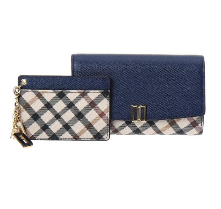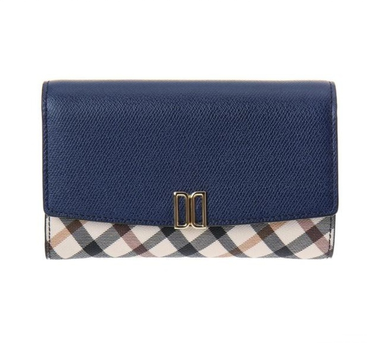 네이비 컬러 바탕에 클래식한 체크 패턴이 어우러져 단정하고 깔끔한 디자인의 중지갑입니다.