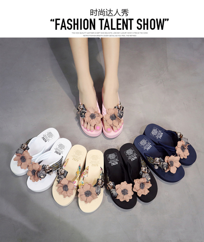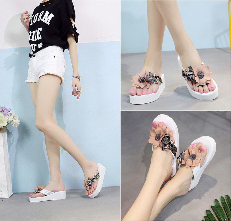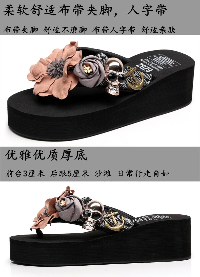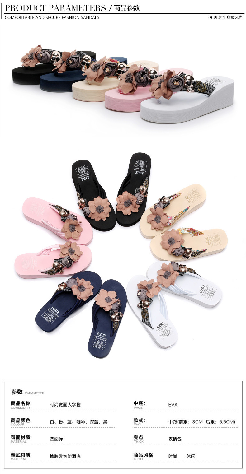 新款韩版坡跟人字拖鞋女夏时尚外穿厚底百搭凉拖鞋甜美花朵沙滩鞋