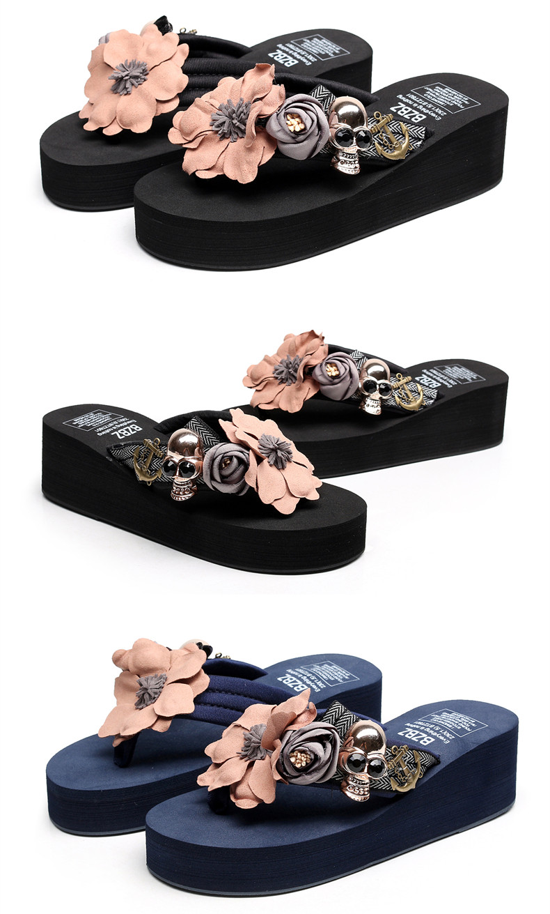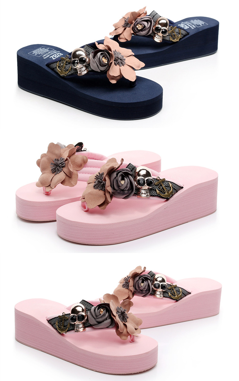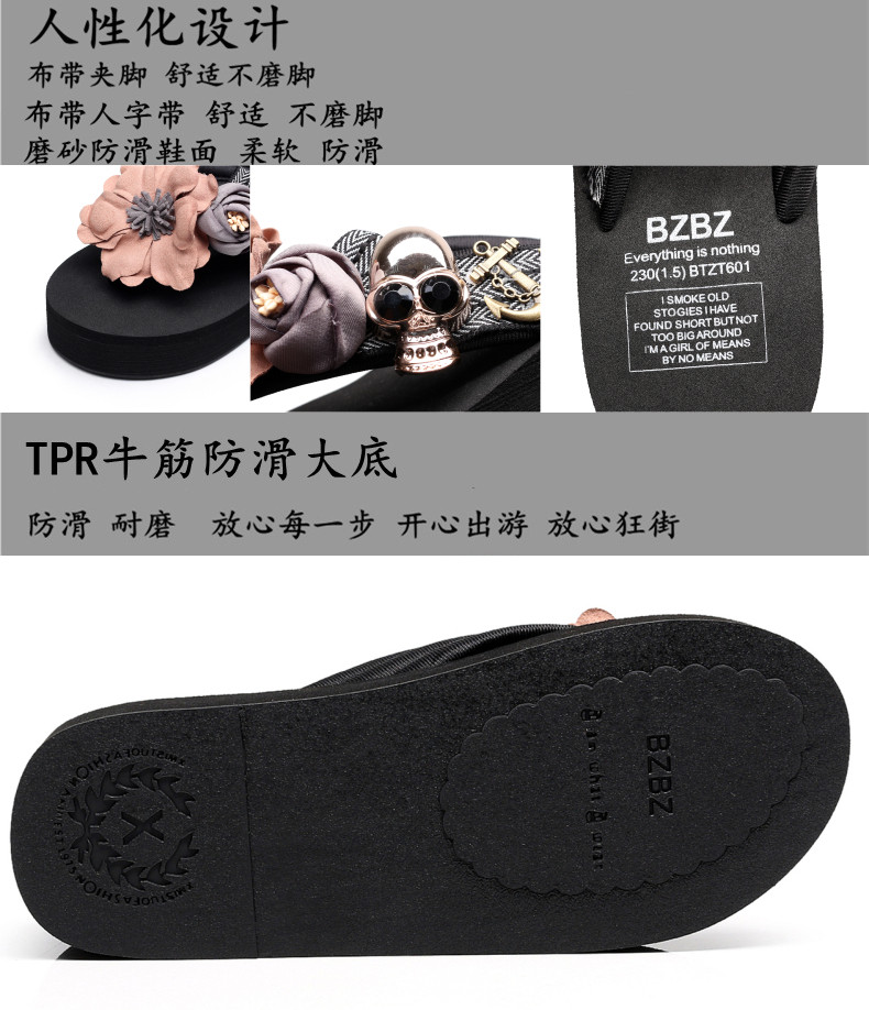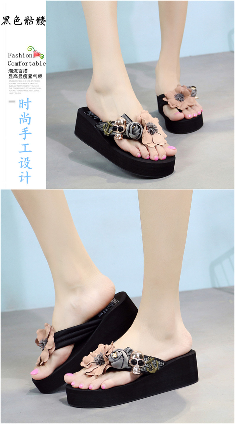 新款韩版坡跟人字拖鞋女夏时尚外穿厚底百搭凉拖鞋甜美花朵沙滩鞋