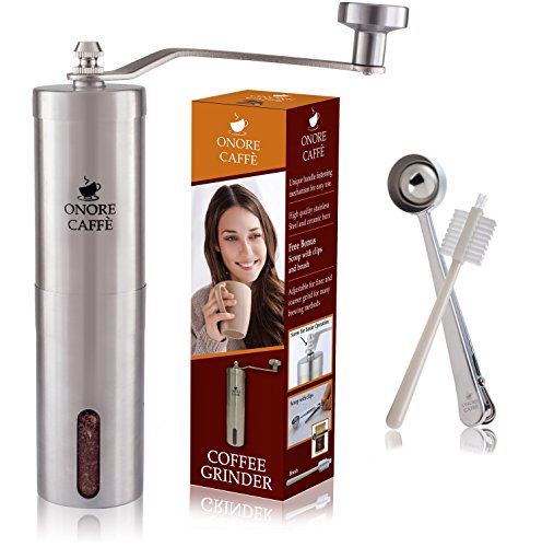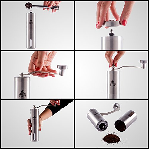 THE HANDLE WILL NEVER FALL OFF - ONORE CAFFE is the only stainless steel manual coffee grinder with a Unique Screw Patent that prevents the handle from falling off while grinding, making it more stable and easier to grind. It is completely made of High Quality stainless steel 304 (18/8), body, handle and knob.