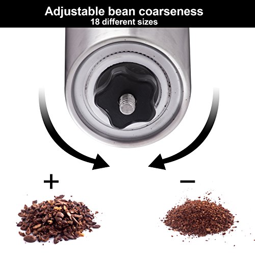 FEEL THE TASTE OF UNMATCHED COFFEE FLAVORS & AROMAS - Our grinder, with its adjustable grind selector has over 18 click settings for 100% precision brewing control over the coarseness of your ground coffee, from fine to coarse grind. It will make your fresh roast, lattes, cappuccinos, and cold brew unforgettable. It pairs well with Aeropress, French Press, Pour Over, Drip Brewing, Espresso, and more!