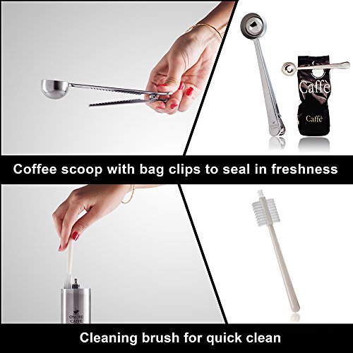 KEEP YOUR COFFEE BEANS FRESH AND YOUR GRINDER ALWAYS CLEAN - Every order comes complete with an additional coffee scoop with bag clips to seal in freshness, and a cleaning brush for a quick and thorough cleaning. If for some reason you are not completely satisfied with your purchase, you will get a 100% refund within 30 days of purchase - NO QUESTIONS ASKED. Order Now While Supplies Still Last!