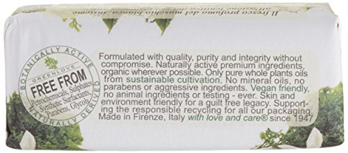 A triple-milled fragrant & handcrafted vegetal soapCreates a rich lather to gently cleanse without drying out skinFormulated with active ingredients for moisturizing benefitsScented with a crisp note of white muskLeaves skin fresh smooth & deeply regenerated Free of mineral oils parabens petrochemicals sulphates & synthetic surfactantsHand-wrapped in paper with beautiful floral illustrations Feature