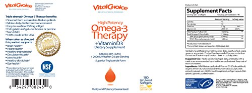 Vital Choice High-Potency Omega-3 Therapy + Vitamin D3 provides concentrated amounts of these broadly beneficial nutrients. Each two-softgel serving provides 1,010mg of omega-3 EPA+DHA. Each two-softgel serving provides 2,000 IU of vitamin D3.Feature