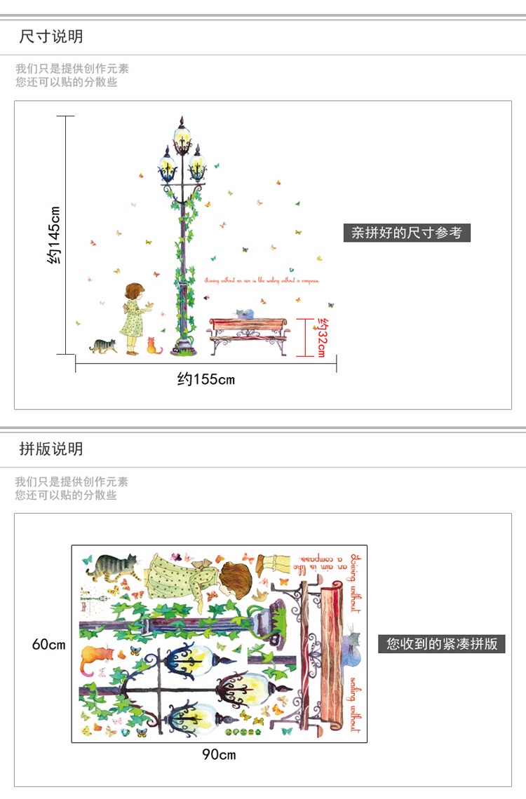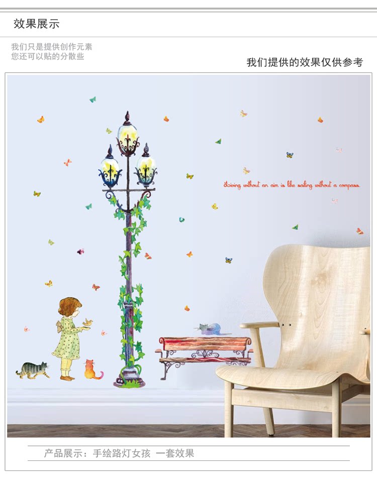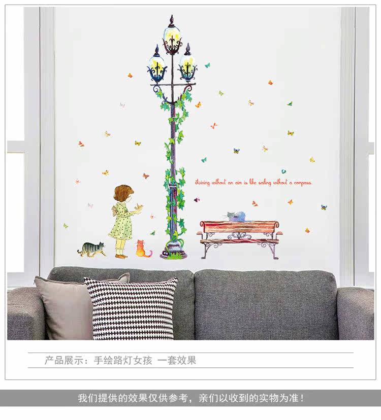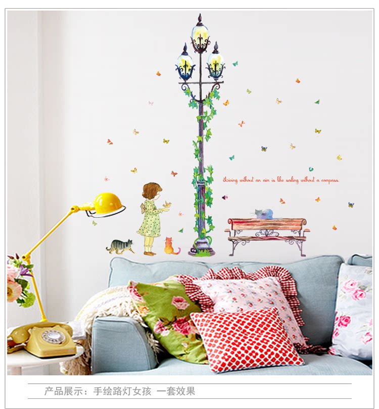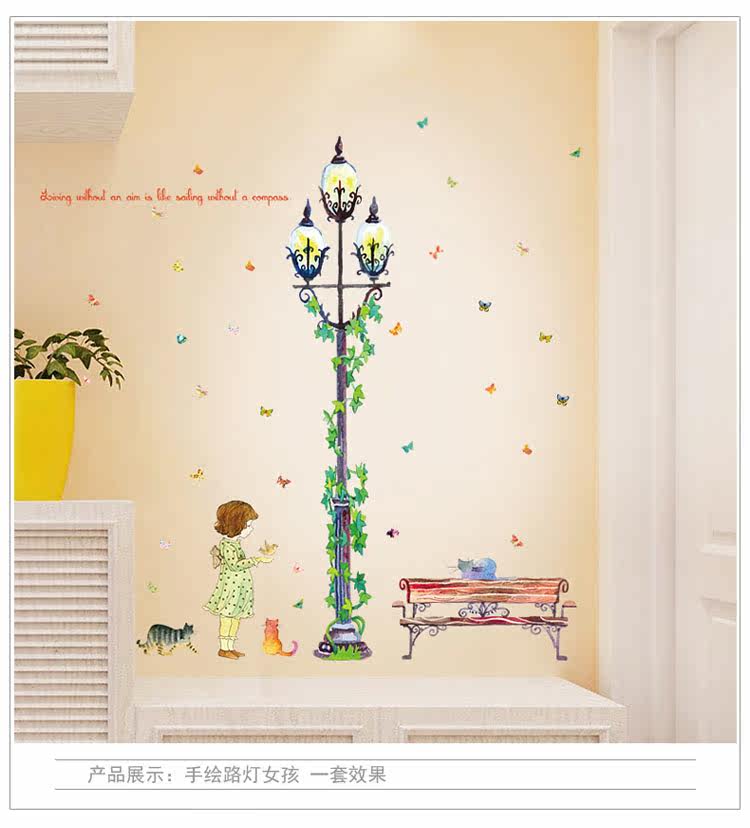 墙贴 女孩绿藤路灯贴纸客厅卧室背景装饰可移除贴画玄关布置自粘