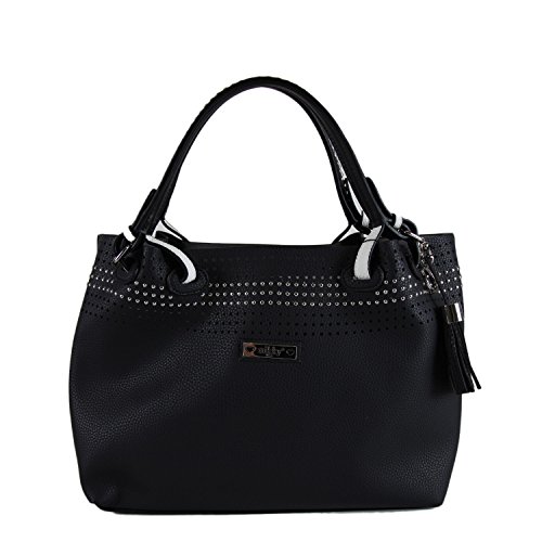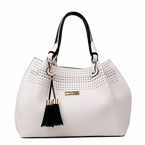 Carry a sign of elegance with the Nikky Starr satchel handbag with every detail displayed. Exterior Features: Nikky exclusive signature nameplate on front. Made of high quality faux leather. Fancy attachable and detachable tassel accents hanging on front with gather design. Laser cut dots with silver studs on front detail. Fascinating dual adjustable and detachable handles with a 8" - 9" inch drop. Studded feature on handles. Interior Features: Spacious main compartment with no closure type. Large soft faux leather interior to fit many everyday essentials. Attached 9"L X 6"H X 0.3"W pouch pocket inside. For cleaning, wipe with damp cloth.Feature