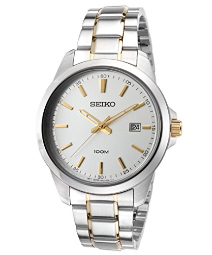 Seiko SUR157P1 Neo Classic men's watch features a 42mm wide and 10mm thick solid stainless steel case with a fixed bezel and textured push-pull crown. Seiko SUR157P1 is powered by an accurate Japanese 6N42 quartz movement. This stylish watch also features a textured silver tone dial with gold tone luminous skeleton hands and index hour markers along with the date display function, scratch resistant mineral crystal and water resistant to 100 meters. Seiko SUR157P1 is equipped with a 20mm wide two tone yellow gold plated solid stainless steel bracelet with a fold over push button clasp. Seiko SUR157P1 men's Neo Classic silver dial two tone stainless steel bracelet watch is brand new and comes in an original Seiko gift box and is backed by a 3 year for USA and 1 year international limited warranty.Feature