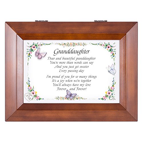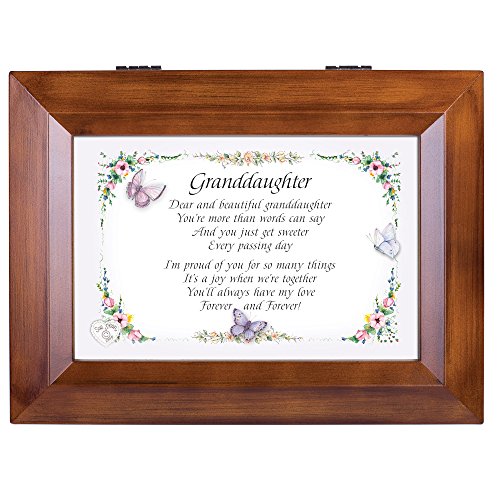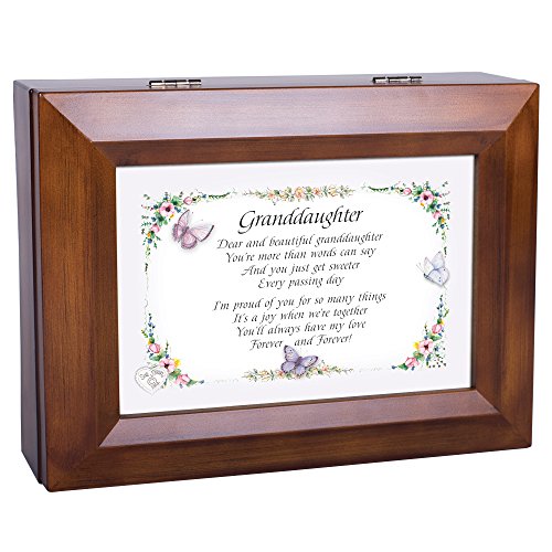 This is a beautifully designed music box by Cottage Garden Collections that features a rich walnut wood finish. It plays a high quality Sankyo music mechanism that can be seen on the inside of the box through protective glass. It plays the tune You Are My Sunshine. It has a 4x6 photo frame lid so the picture can be exchange for a personal photo. The feet are cushioned so they don't scratch surfaces. The box has a 4x4x1.5 inch cavity for storing jewelry and keepsakes. The inside is lined in nice black velvet. The hinges prevent the lid from falling all the way back and getting damaged when opened. This makes a beautiful gift for any age.Feature