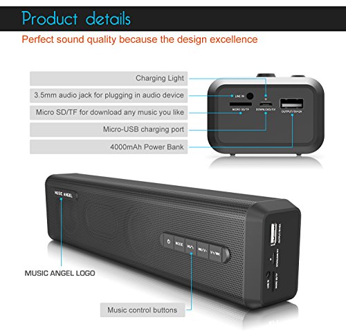 Title : Bluetooth speaker MUSIC ANGEL Wireless Portable Stereo Speakers with Enhanced bass Resonator Bluetooth 4.0 Built-in Mic 4000mAh Rechargeable Battery 12 Playing Hours