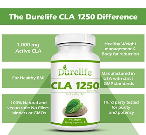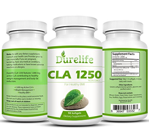 -. Feature : High Potency CLA 1,250 mg 90 softgel Count Is Backed By A 90 DAY SATISFACTION OR MONEY BACK GUARANTEE, Purchase With Confidence Knowing That We Only Source The Absolute Best Quality CLA Available On The Market / DureLife CLA Supplement May Help Maintain Healthy Bmi And Decreases Number And Size Of Adipocytes (fat Cells), Lowering Your Body Fat Mass. And Increases The Rate At Which Fat Cells Disintegrate, Reducing The Number Of Existing Fat Cells In Your Body. / DureLife CLA 1,250 Supplement Has Multiple Health Benefits Such As Healthy Immune System, Anti-inflammatory And Healthy Hair, Skin And Nails. / DureLife CLA 1,250 Mg SoftGel Is Made From BOVINE GELATIN Which Is the Best Source of SoftGel Gelatin according To the Latest Studies. / DureLife CLA 1,250 90 softgel Count Are Preservatives, Gluten, and GMO free. Manufactured And Packaged In The USA In a GMP Approved Facility for purity and potency