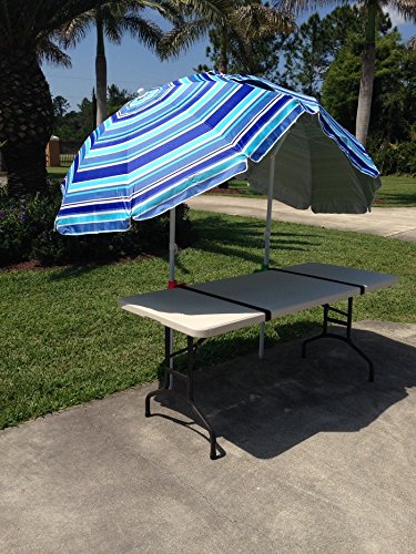 Accommodates beach umbrellas using thumbscrew tightening. Installs without tools.