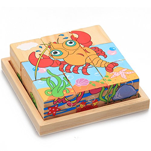 9 cubes wood puzzle and a wooden tray. Size: 5" x 5", Ages for 3 and up. Each wooden block puzzle creates 6 different images of sea animals. Colorful preschool puzzles improve toddlers' colors identify ability. The educational puzzle toy promotes hand-eye coordination and matching skills.
