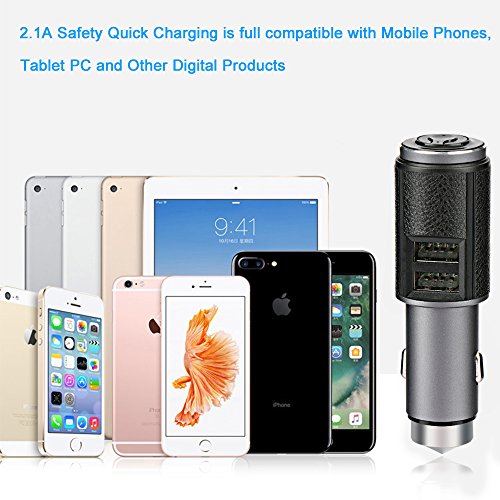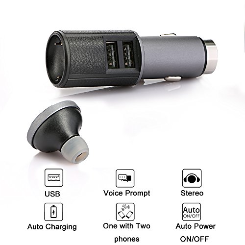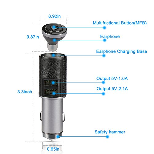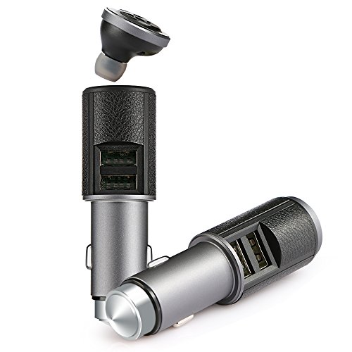 YILILK Car Charger with Bluetooth Headset, 3 in 1 Bluethooth Headphone with Dual USB Port and Safety Hammer for iPhone Samsung Galaxy and Android Cell Phones (Black / Titanium)