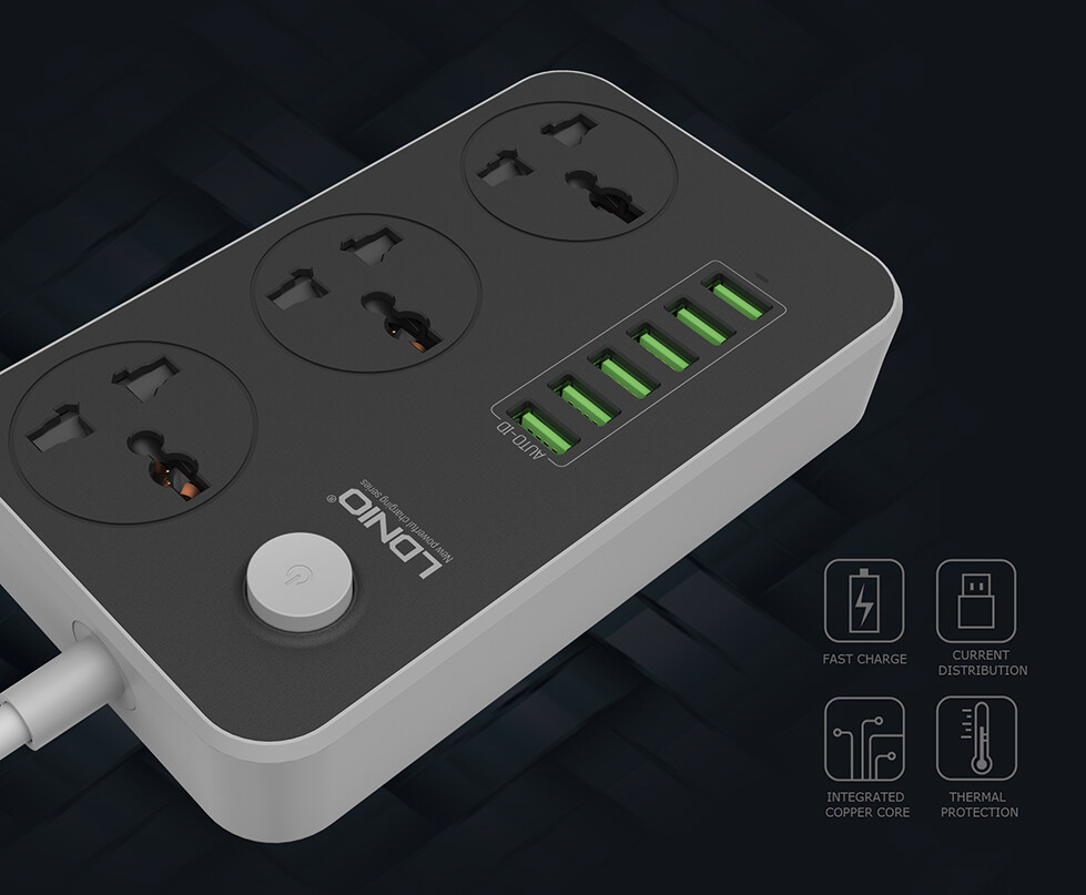 LDNIO SC3604 Power Strip with 3 AC Sockets + 6 USB Ports - Black / EU Plug