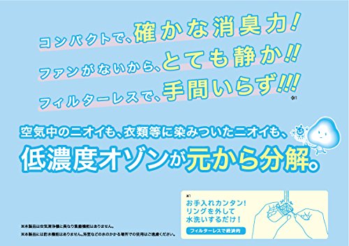 -. Feature : オゾンのもつ強い酸化力で、菌やウィルス・臭いを元から分解。特許技術の「多重リング式コロナ放電」で、ファンレスなのに風が出る静音設計。 / メチルメルカプタン(玉ねぎが腐ったような臭い)や、アンモニア(ペット臭)などのいやな臭いを低減させます / 本体搭載のリングを外してブラシなどで水洗いするだけなので、お手入れが簡単です。 / 全てのニオイ・菌・ウィルスに効果があるわけではありません。消臭効果については日本食品分析センターにて密閉空間で効果を確認しています。実使用空間での実証効果ではありません。効果を持続させるために連続でご使用になることをおすすめします。 / 本製品はリチウムイオン電池を内蔵しています。