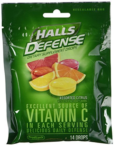 -. Feature : Halls Defense Vitamin C Cough Drops Assorted Citrus Flavor drops / provide 100 percent of the recommended daily value of vitamin C. / Assorted citrus flavors / 180 individually wrapped pieces per bag / Resealable bag to ensure freshness