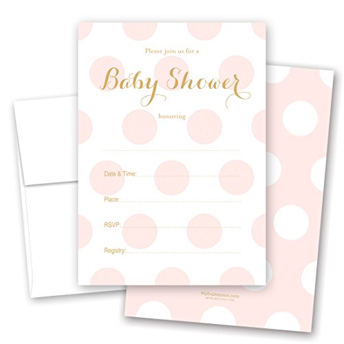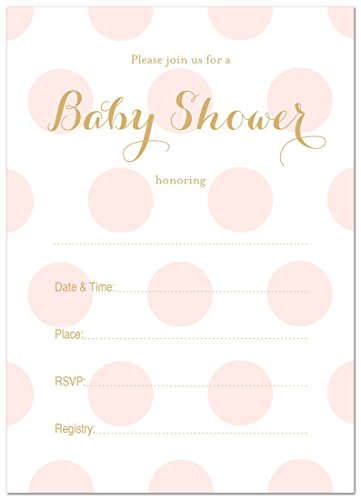 This cute baby shower fill-in invitation features a gold glitter graphic Baby Shower text with as pink polka dot border. Perfect baby shower invitation for those short on time.