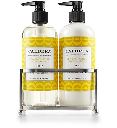 Caldrea Sea Salt Neroli Petite Sink Set in stainless is perfect for a smaller sink or in a bathroom. Our petite, beautifully wrought caddy is sturdy, water-resistant, and shaped to hold our Hand Soap Liquid and Hand Lotion. Each set includes: Hand Soap Liquid, 11 oz Hand Lotion, 11 oz petite stainless caddy. Perfect for the guest bath, hostess or next to kitchen sink.Feature