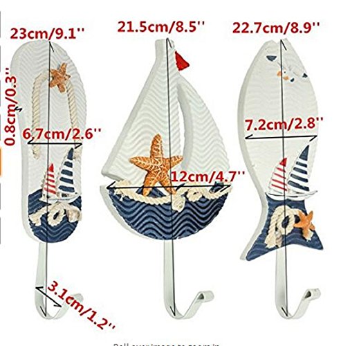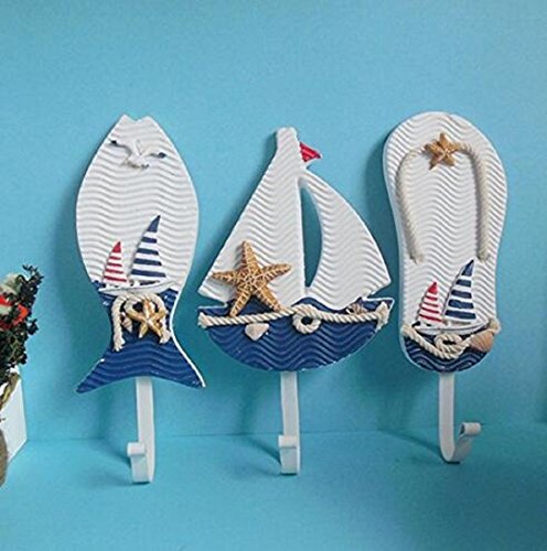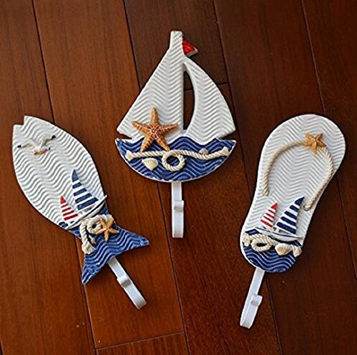 -. Feature : High-quality three-piece wood and metal clothing hooks, Mediterranean style.These hooks are very cute looks like Slippers, Fish, Sailing. / Use together or separately as towel hook,coat rack,hat rack,etc.Great Decoration & Usefulness in the Home,Office,or Garden. / It not only as a hook,also can decor your room.This is a good gift to your friend. / Size: 9" H x 2.5 " W x 0.3" D / 3pack