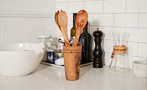 Product Description Made in Tunisia, these handcrafted, hand smoothed, Olive Wood Salad Servers with a Holder will make your cooking and serving needs a breeze. Each set (Fork and Salad Spoon Holder) has a natural grain and smooth finish that will give your kitchen a unique and stylish compliment. To maintain the superior quality of your set, we recommend: - Hand wash only
