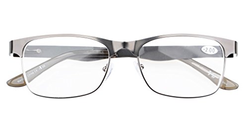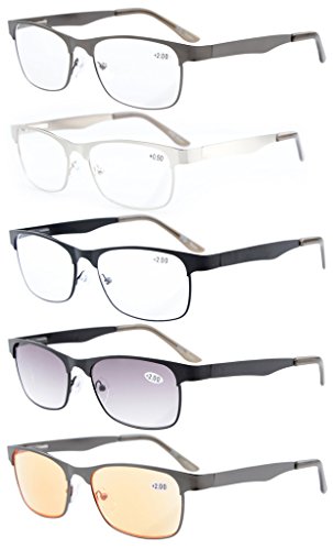 -. Feature : PRODUCTS DIMENSION-Frame material: Metal,Lens width: 2 1/16" (52mm),Frame width: 5 1/2"(140mm),Lens height: 1 7/16" (36mm),Frame height: 1 9/16" (39mm),Bridge (DBL): 5/8"(16mm),Temple length: 5 1/2"(140mm),Spring hinge: Yes,Lenses: Aspheric,Head size: Medium to wider / EYEKEPPER SPRING HINGE READING GLASSES-the pupil distance(PD) is 59-63mm,the deviation for pupil distance(PD) less than 2mm,the deviation for strength less than 0.02,the deviation for lenses's horizontal line less than 1mm / EYEKEPPER READING GLASSES-5 pack at 1 Low Price,Sets come in 1 power of your choice. These are not mixed powers. Acrylic Lens and Optically Correct.Grey tinted lenses great for outdoor reading,Amber lenses for computer,UV Protection, Anti Glare,Anti Blue Rays / QUALITY FRAME -FDA Registered Reading Glasses and Eyewear,Accord with ANSI Z80.3-2010,Accord with BS EN ISO 12312-1:2013 and EN14139:2010,Accord with AS/NZS 1067:2009,Top quality metal frame,lenses and have spring-loaded hinges / LIFETIME BREAKAGE WARRANTY&30 DAY MONEY BACK GUARANTEE: In case any broken problem happens, contact the seller of Eyekepper without hesitation to solve the problem until satisfaction. Eyekepper provides lifetime after sale service for all Eyekepper reading glasses. Customers can return and get refunded for any reason. You have no risk to try