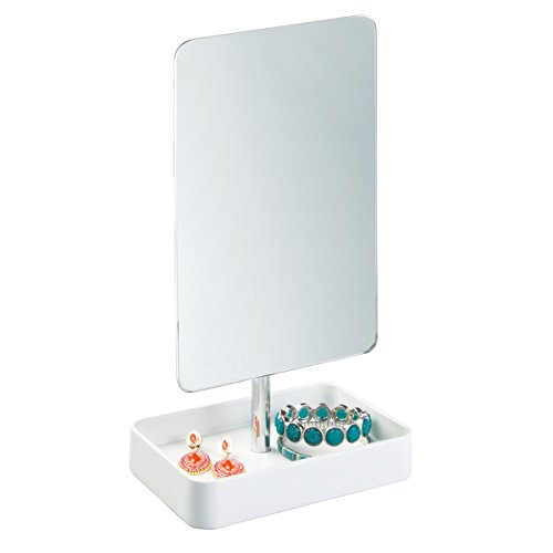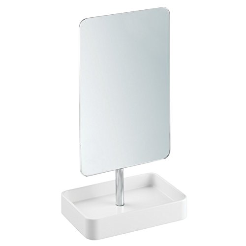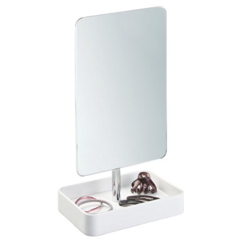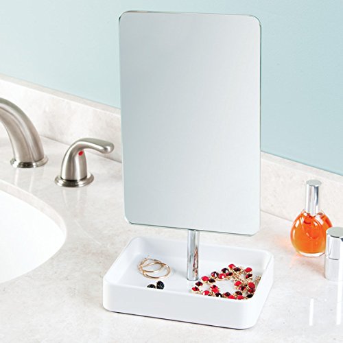 mDesign Free Standing Bathroom Vanity Makeup Mirror with Tray for Jewelry, Accessories - Square, White/Chrome