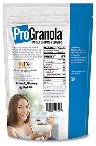 -. Feature : Delicious High Protein Granola Cereal (Gluten Free, Grain Free, Soy Free, Low Net Carb) / 1 Serving (Approx 1/2 Cup) = 97 Calories, 12g Egg White Protein & 2 Net Carbs / Low Carb, High Fiber, and High In Protein (Two Bag Value Pack) (GMO Free) (6 Bags Value Pack) / Delicious, Crunchy, Vanilla Cinnamon Taste That Curbs Appetite Without Bloating / IKDiet Compliant (Phase 1 & 2) Organic Seeds, No Junk (Sugar Free : Monk Fruit Sweetened)