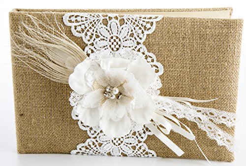 - Feature : LASTING MEMORIES: We know that you'll never want to forget each and every friend and family member that takes part in your special day. Maven Gifts has created this beautiful Lillian Rose wedding bundle, featuring the Burlap and Lace Guest Book and matching Burlap and Lace Pen Set. / GUEST BOOK: Our burlap guest book is beautifully crafted for a unique and timeless look. The cover is crafted from tan burlap and decorated with a rhinestone filled, hand crafted paper flower. A natural peacock accent feather and intricate lace design tie the look together. / ACCOMMODATING: This guest book has 30 two-sided pages for a total of 580 signatures -- the front and back of each page has the header "Guests" and 9 blank lines. It can accommodate every guest at even large weddings. / PEN SET: Our pen set is designer to perfectly match the guest book. The base features a flower with rhinestone ornament in the center, a natural peacock feather, and lace and ribbon. The sleek silver pen is mounted on a swiveling base and writes in black ink. / PRODUCT SPECIFICATIONS: The 55-page guest book (#GB560) measures 10" x 6.5" x 1." The pen base (#PEN560) measures 3.25" x 3.25," and the silver pen measures 6" tall.