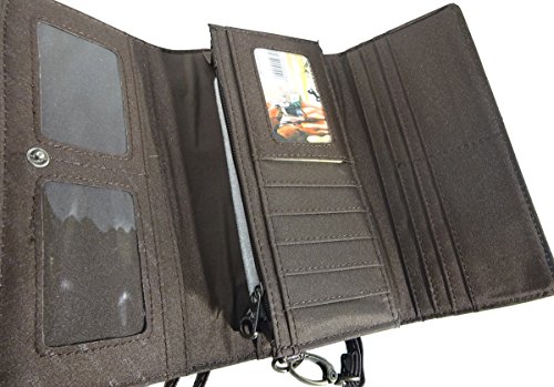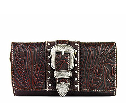 * Floral Tooling on Genuine Leather on Front, Faux leather Trim and Backing * Antique Western Buckle on Front with Silver Stud Accents * Zipper Pocket on Back * Removable, Wristlet Strap Inside: * 5 Bill Pockets, Zipper Pocket, 11 Card Slots, 3 ID slots
