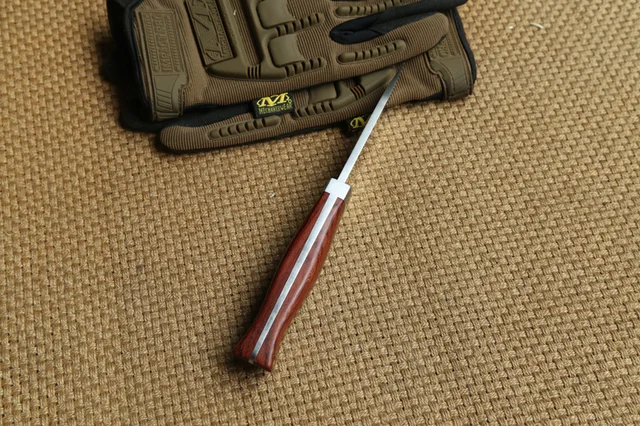 상품 내용 길이: 208 미리메터 블레이드 폭: 27.5 미리메터 두께: 4.2 미리메터 블레이드 길이: 97 미리메터 핸들 길이: 110.5 미리메터 블레이드: 9cr18MOV 경도: 58-59HRC 그물 칼: 168 그램 핸들 재질: 천연 붉은 신 나뭇 가지 나무 (3D 스테레오 표면) 핸들 용골 만든 얇은 얇은 무게, 및 패치 고정 모자이크 네일. 안에 가죽 칼집 조각 함께 용융. 크래프트 판지 포장 포장 상세