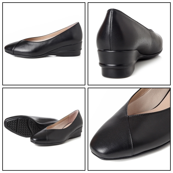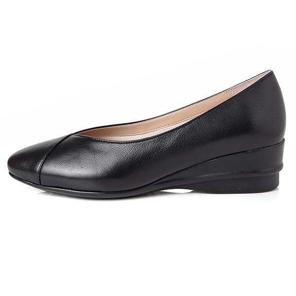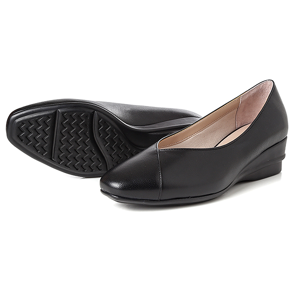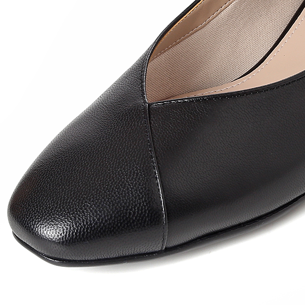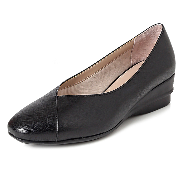 여성스러운 쉐입의 스퀘어 토에 베이직한 어퍼 디자인의 컴포트 플랫 슈즈.