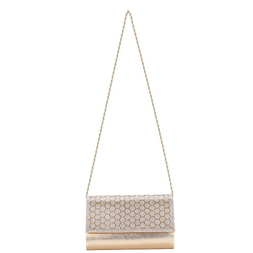 Clutch by hand, tote or crossbody bag use,with 22"in removable gold-tone chain.
