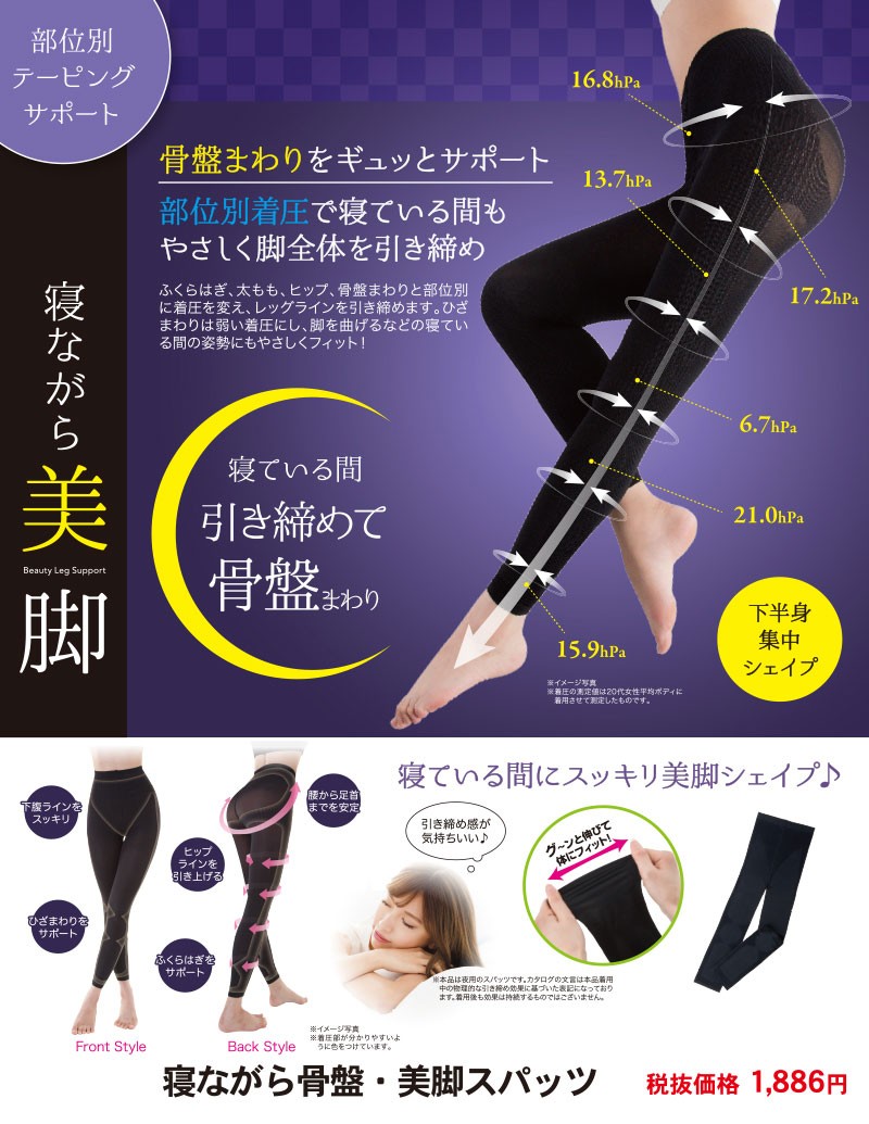 | 商品説明 | 寝ている間に骨盤をケア・着圧効果で美脚も!! ●三段圧テーピングサポート編み 足首、ふくらはぎ、ふとももとサポート力を調節して美しい脚と快適な履き心地をキープ!! ●ヒップアップ ヒップを包み込み、魅力的なヒップにキュッ! |