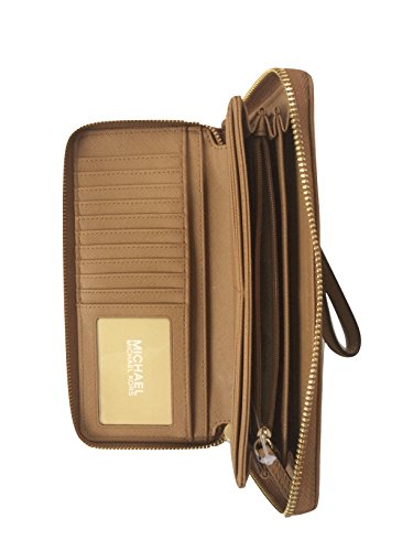 Zip around style with logo nameplate on the front and removable wristlet strap