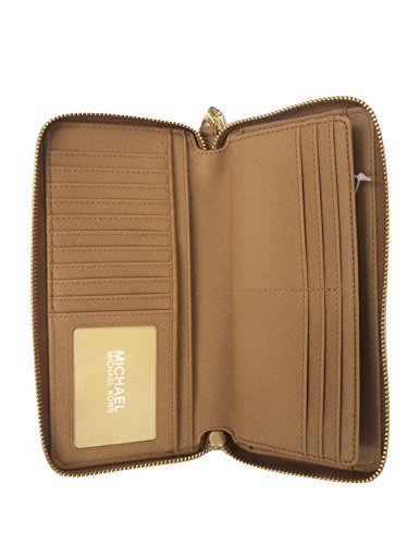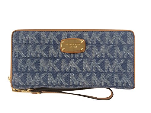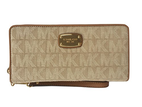 Large travel wallet and wristlet wrapped in monogram print jacquard fabric with gold tone hardware