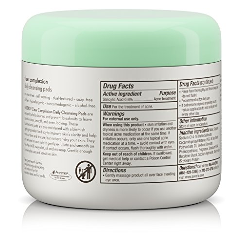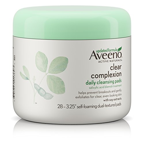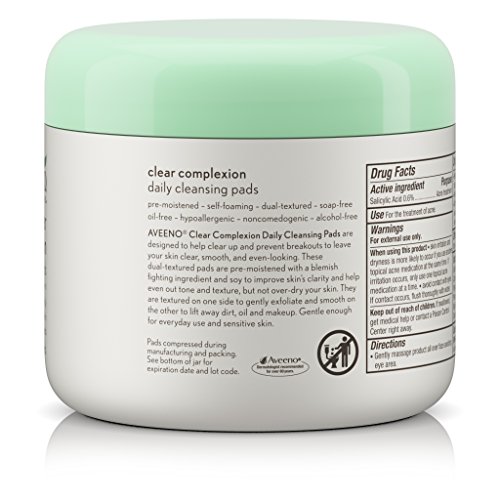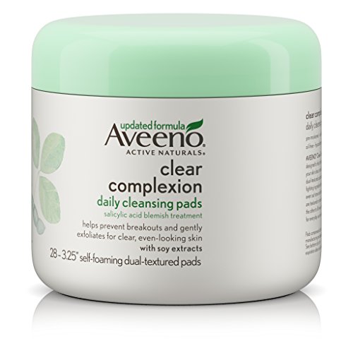 Aveeno Complexion Daily Cleansing Pads are pre-moistened, self-foaming pads that help prevent breakouts without over-drying your skin. One side is lightly textured to exfoliate skin, and the other is smooth to lift away dirt, oil, and makeup. The pads are pre-moistened with salicylic acid and Active Naturals soy extracts to fight acne and help even out skin tone and texture without over-drying. The oil-free formula is soap-free, alcohol-free, hypoallergenic, and non-comedogenic, so it's gentle enough for everyday use even for sensitive skin.Feature