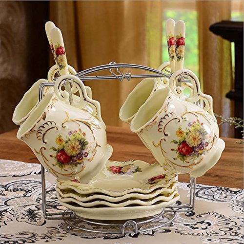 -. Feature : Material: Bone China / Size: saucer diameter 15cm, Cup-caliber 10cm, high 11.5cm / Contains 4 cups, 4 saucers, 4 spoons, a stainless steel shelf / Tea or coffee is a good choice / Can be used as a gift